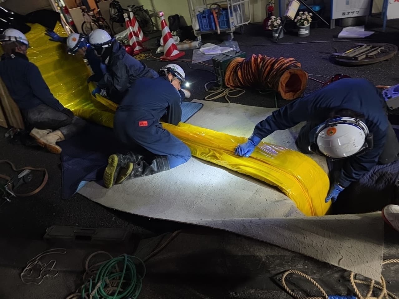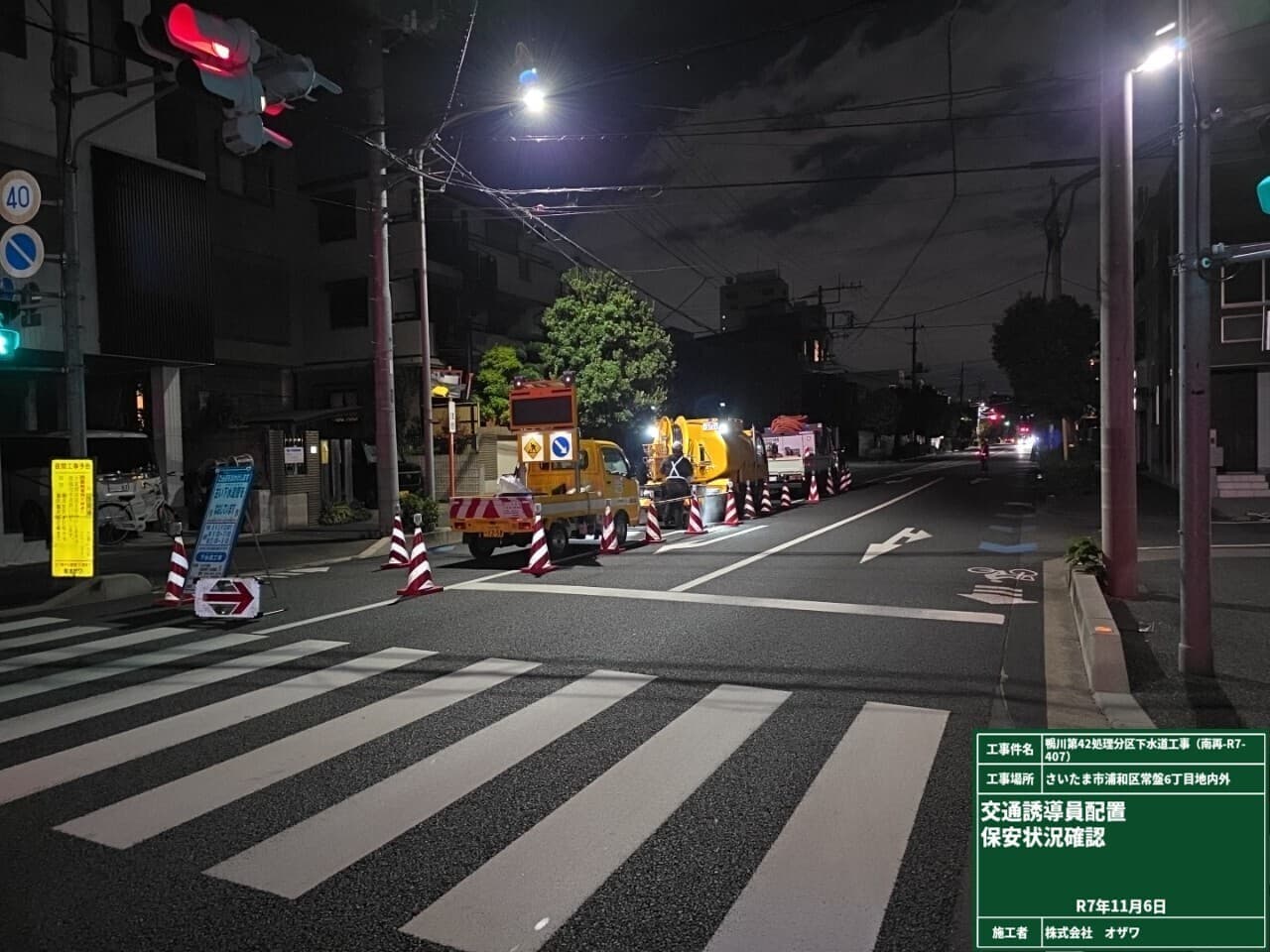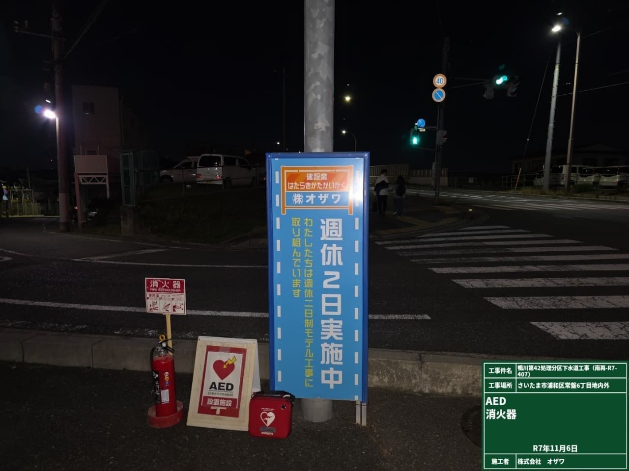 交通への影響を最小限にするため、通行規制を行い、安全対策を徹底して作業しました。また、緊急時の対応に万全を期するため、現場内にAEDを設置しました。